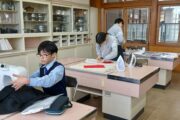 - 6年生・家庭科:ミシンと格闘中!自分だけのエプロン作り…
