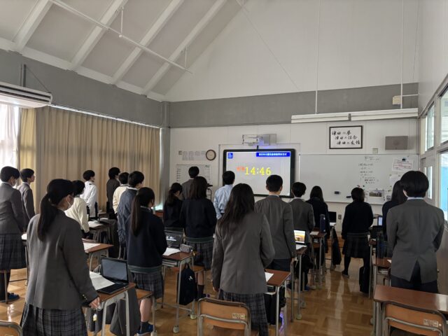 平成23年3月11日に発生した東日本大震災から14年となりました。 この震災で犠牲となられた方々に対して哀悼の意を表するため、地震発生時刻の14時46分に合わせて生徒・教職員が黙祷を捧げました。