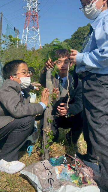 4/30(水)、中学1年生が寺本豊校長先生の指導のもと、 運動場横の斜面に桜の木の植樹を行いました。