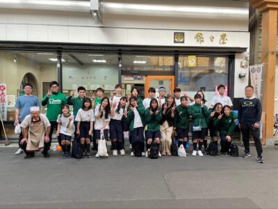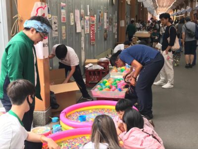 5月25日(日)、寺町通り商店街で「てらまち学習会」というイベントが実施され、インターアクト部員18名が運営を手伝いました。商店街の各店舗が実施している体験活動や、スーパーボールすくい・輪投げ・水風船つりなどのゲームコーナーを担当しました。イベントは朝から大盛況で忙しい時間帯が続きましたが、生徒たちは笑顔を絶やさずに来場者をもてなし、自分たちでよく考えながら動いてくれました。来場者の子どもたちやその保護者、商店街の方々にもたいへん喜んでいただきました。天候にも恵まれ、爽やかな一日でした。