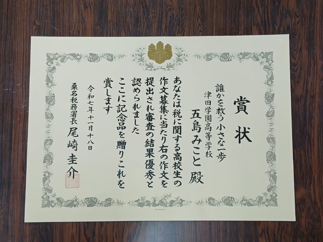税についての作文で、本校生徒が「桑名税務署長賞」を受賞