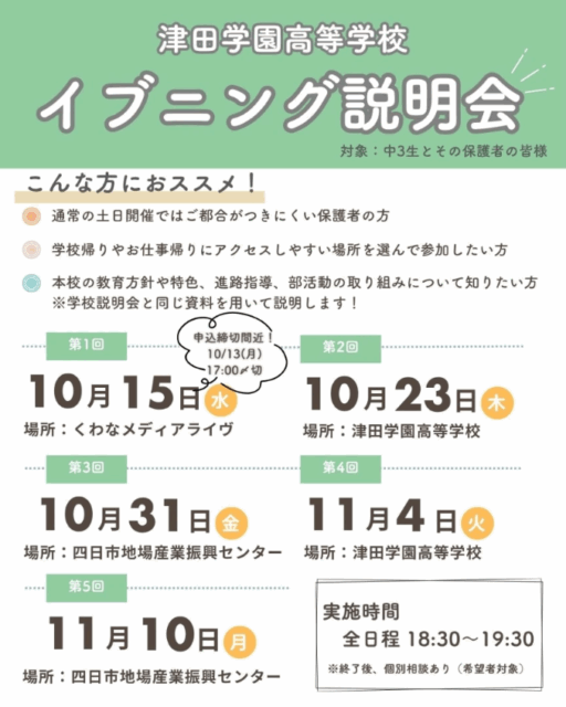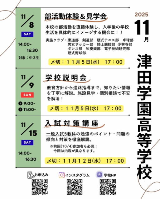 入試に向けて参加できる募集行事も、残り少なくなってきました ! 津田学園高等学校の魅力を知る、最後のチャンスをお見逃しなく✨ ぜひご参加ください! #津田学園高校 #高校受験 #学校説明会 #部活動体験 #入試対策 #中 […]