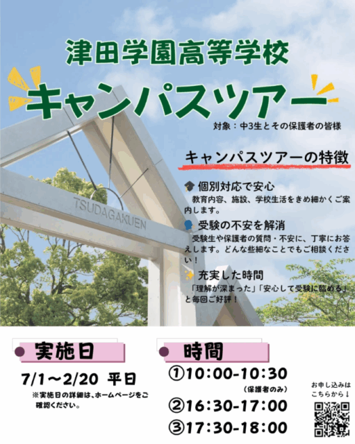 中3生とその保護者の皆様へ! 津田学園高等学校のキャンパスツアーで、受験の不安を解消しませんか? キャンパスツアーのココがポイント! ◆個別対応で安心:教育内容、施設、学校生活をきめ細かくご案内します。個別だから、気にな […]
