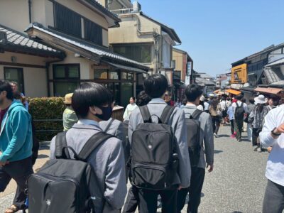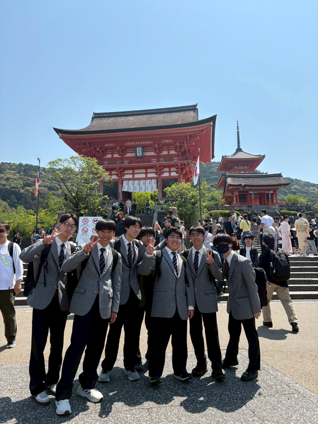 4月30日(水)、3年生が遠足で京都を訪れました。京都到着後、まずは全員で集合写真を撮影し、その後は各グループに分かれて清水寺周辺の自由散策を行いました。連休谷間ということもあり、参道は国内外からの多くの観光客で大変賑わっており、生徒たちはその活気の中で、日本の伝統文化と異文化が交流する様子を五感を通して感じたようです。活気あふれる伝統的な京都の街並みを肌で感じ、日本の歴史と文化に触れる貴重な時間を過ごすことができました。
