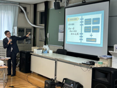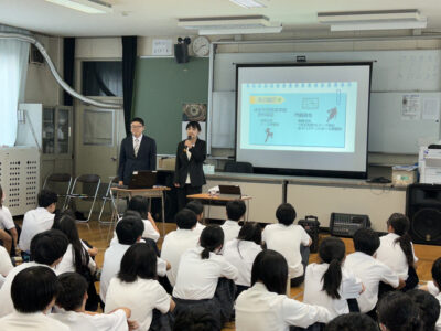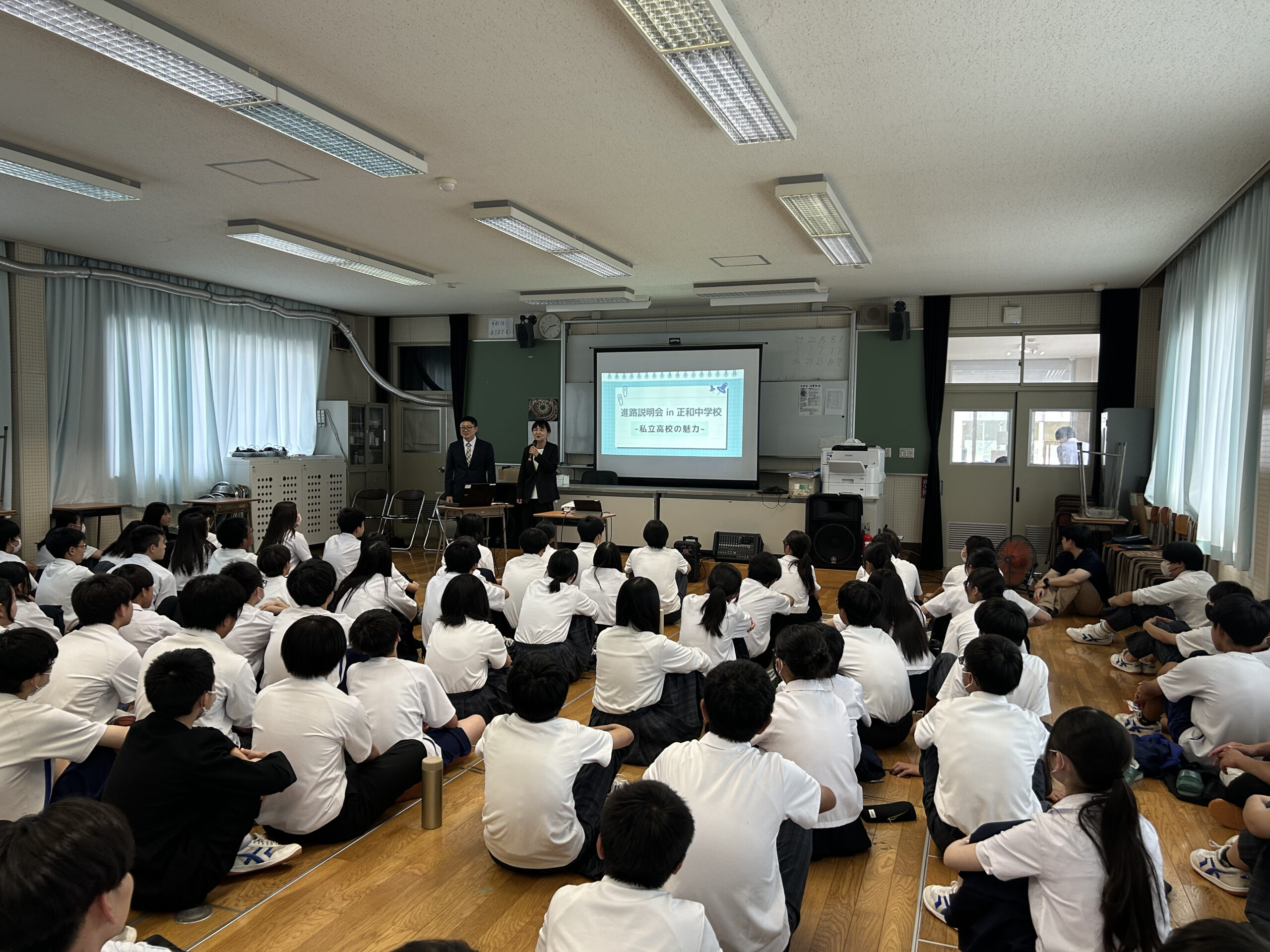 7月3日(木)、桑名市立正和中学校にて「進路説明会In正和中学校-私立中学校の魅力-」が開催され、津田学園高等学校が私立高校の魅力を伝えました。中学3年生104名が参加し、本校職員による説明に熱心に耳を傾けてくれました。