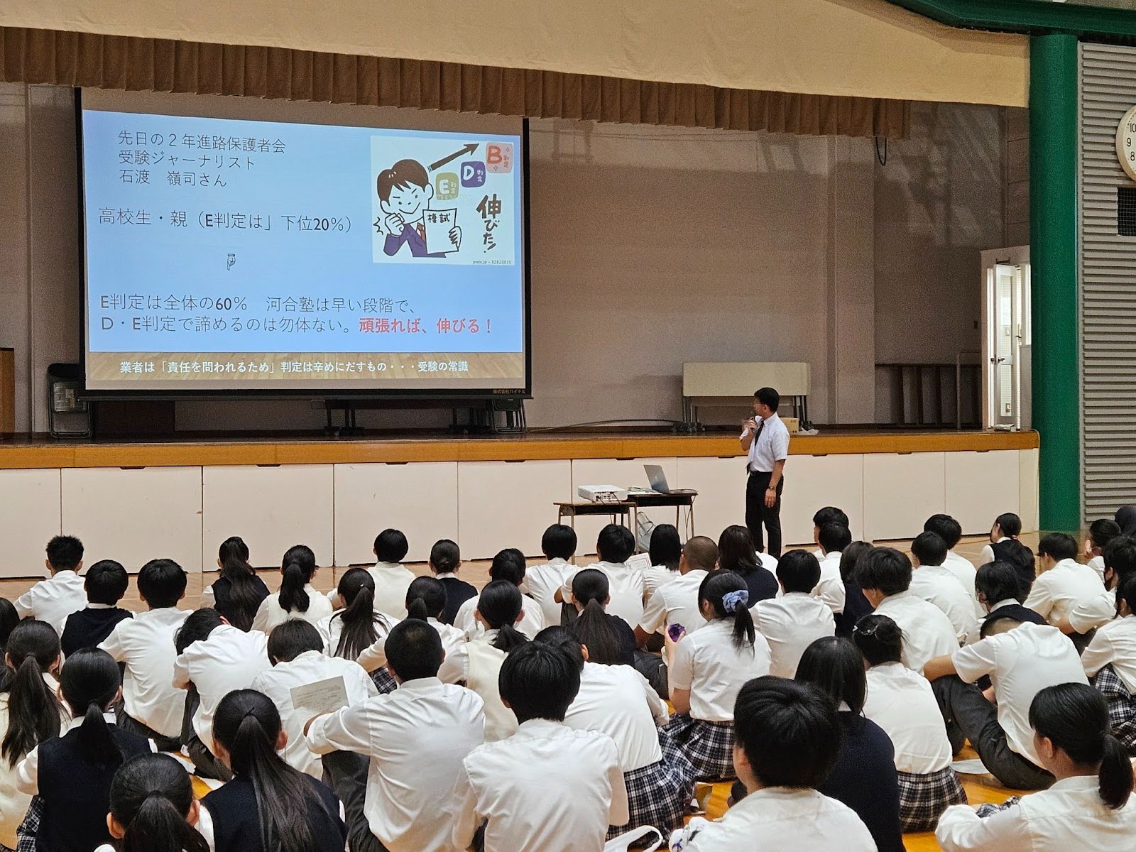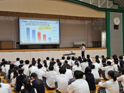 本校では、7月3日(木)に高校2年生の保護者を対象とした進路保護者会を実施しました。その内容を踏まえ、7月9日(水)のLHRにて、進路指導室長の三谷より高校2年生の生徒を対象とした講演会を開催しました。 講演では、保護者会の内容をもとに、今後の進路選択に向けて生徒自身が考え、行動を起こせるような具体的なアドバイスが伝えられました。