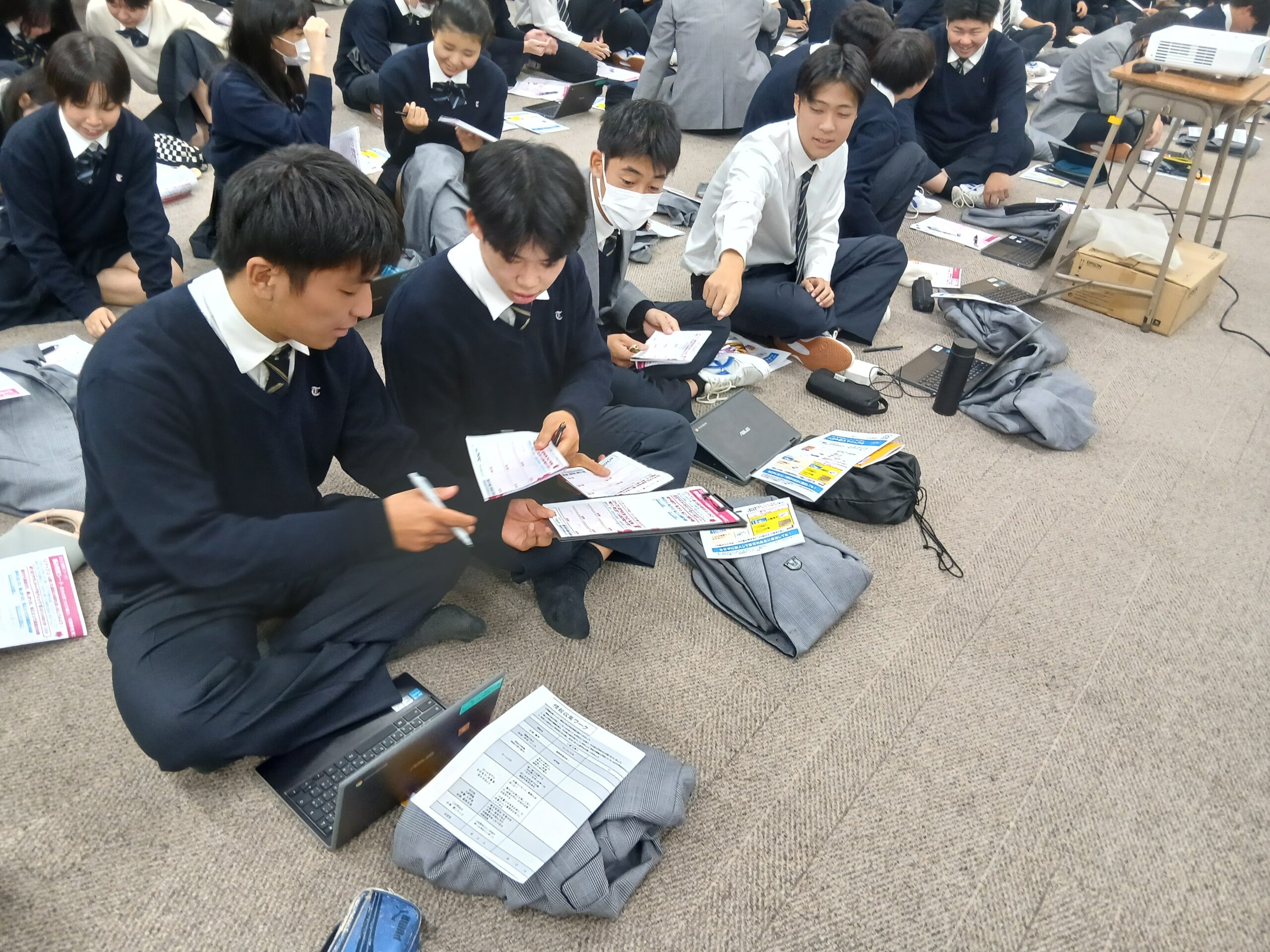 講演の後は、学年担当の教員より、今後の進路活動に向けた具体的な指導を行いました。まず、進路選択の参考となる動画を視聴し、その後、マイナビ発行の「パンフとりよせ号」を活用した資料請求の進め方を確認しました 。生徒たちは自分の興味がある大学や専門学校の資料を熱心に選び、ハガキの記入を行いました 。今回の講演会と指導を通じ、生徒一人ひとりが自分自身の将来についてより具体的に考え、一歩踏み出すきっかけとなることを期待しています。