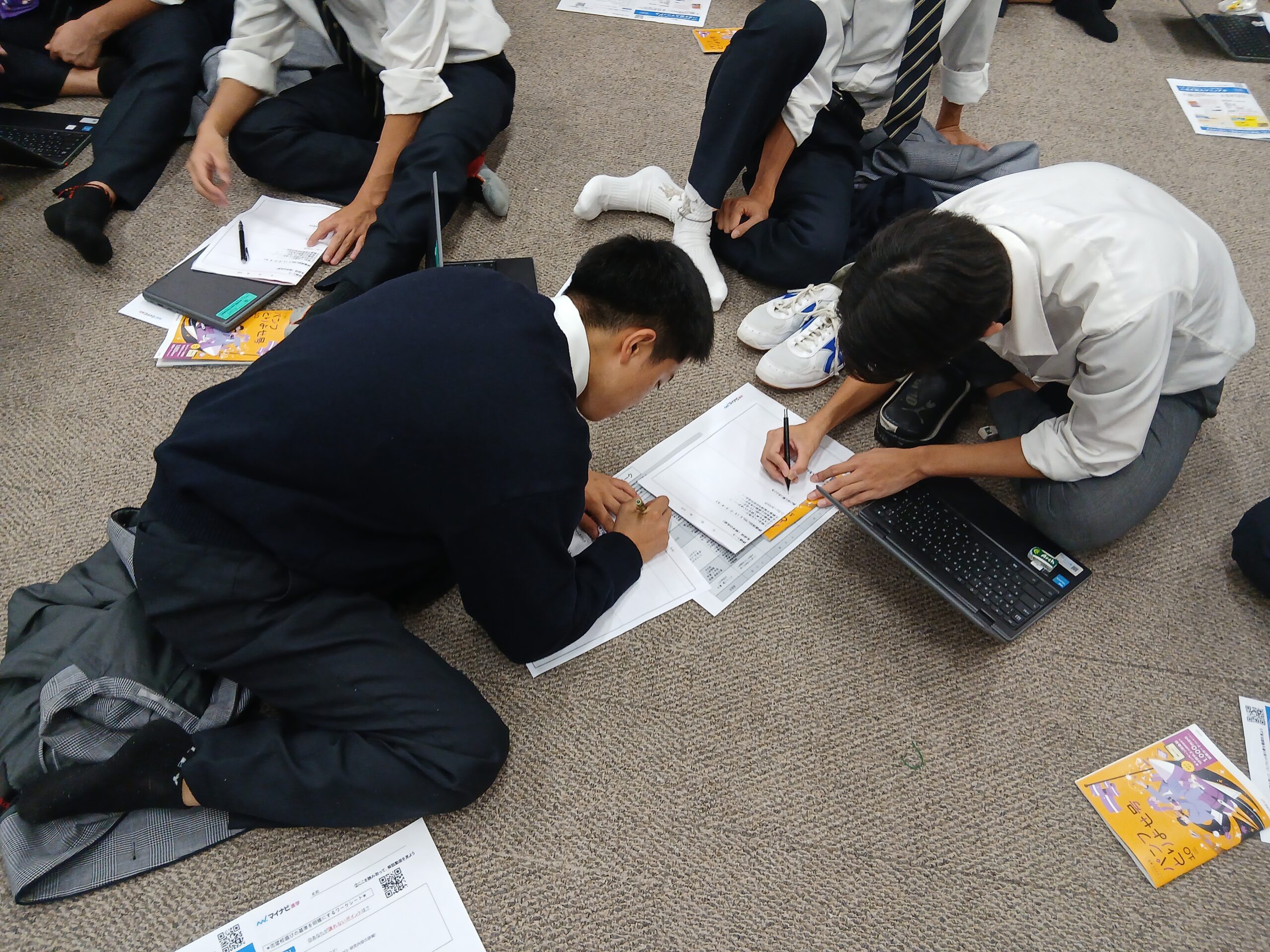 前半の2時間は、株式会社マイナビの石原伶名様を講師にお招きし、「自己理解+面接導入講座」をご担当いただきました。生徒たちは、自己分析を通じて自分の強みを再確認するとともに、面接の基礎知識について専門的な視点から学びました。真剣な表情で耳を傾ける姿が印象的でした。