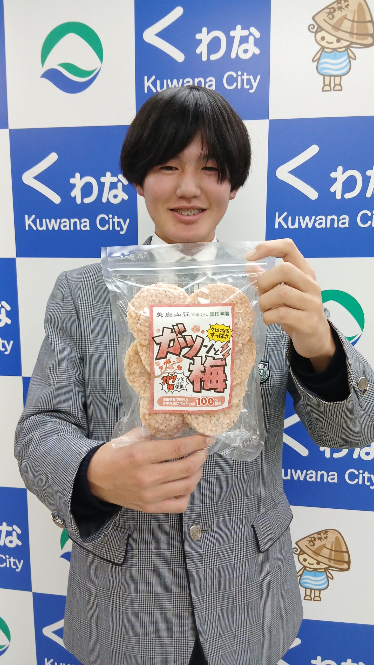 探究活動の一環として、地元の名店「美鹿山荘」様のご協力のもと開発した新商品、その名も「ガツンと梅」。商品の完成を報告するため、開発メンバーで桑名市長のもとへ表敬訪問に伺いました。今夏、本校野球部が甲子園に出場した「あの夏の熱気」をイメージ。メンバーで何度も試食と議論を重ね、汗をかいた体に染み渡るような「ガツン!」とくる梅味に仕上げました!