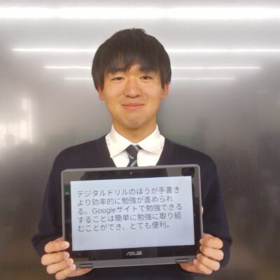 英語科「論理・表現」の授業(高1文理コース・高2総合進学コース、 担当 鈴木太郎 教諭)では、Googleの「デジタル学習基盤」