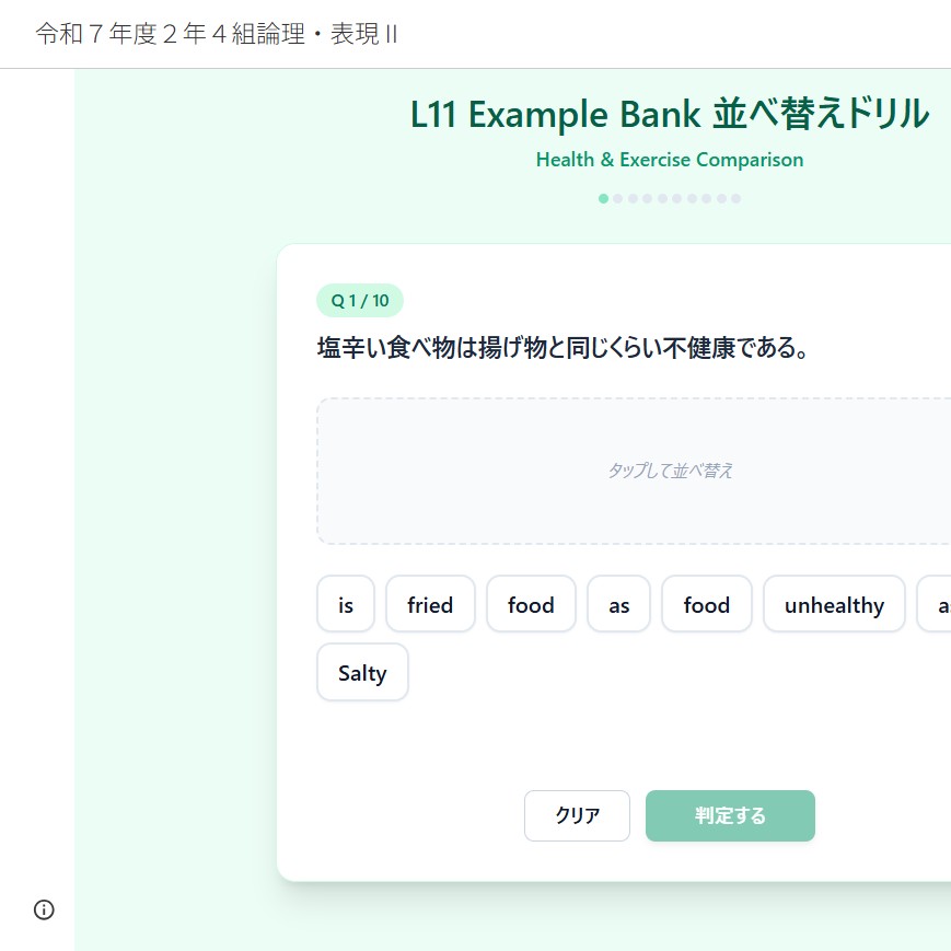 で作成・運用している授業専用ウェブサイト - AI学習アプリ :Google AI Geminiで検定教科書内の英語定型表現定着のために独自作成