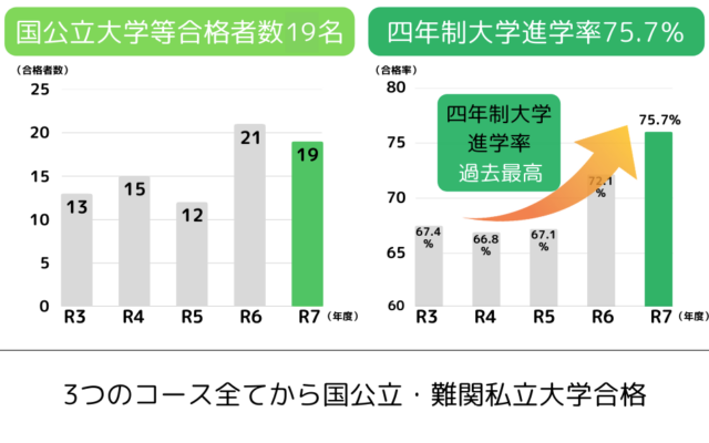 | 特別進学コース | 三重大学 教育学部/静岡大学 理学部/三重県立看護大学 看護学部/ 県立広島大学 生物資源科学部/富山県立大学 工学部/ 高知工科大学 情報学群/高知工科大学 システム工学群/ 東京藝術大学 美術学部 |