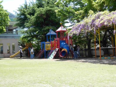 津田学園の幼稚園では、毎月1回、園庭開放を実施しております。 4月24日には津田第一幼稚園にて園庭開放が行われました。良いお天気に恵まれ、芝生の園庭では子どもたちが走り回ったり、ボール遊びをしたり、大型遊具の滑り台で滑ったり、砂場でアイスクリーム屋さんごっこをしたりと思い思いに楽しく過ごしていました。また、室内では小さなアスレチックや知育玩具、赤ちゃん用の玩具で遊びながら和やかな時間を過ごしました。さらに、今月の寝相アートのテーマは「子どもの日」でした。子どもたちはかぶとをかぶり、こいのぼりに乗ってまるで泳いでいるかのような可愛らしい写真が撮影されました。