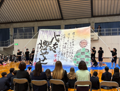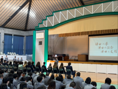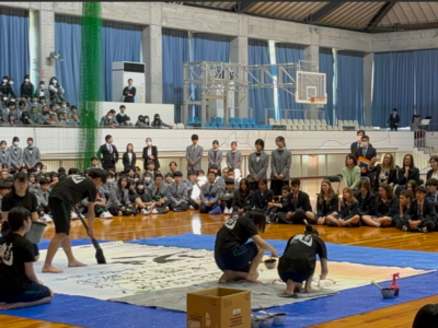 4月21日、英国の(Holme Grange School)からの留学生歓迎会を開催しました。まず、学校法人津田学園の創立からの歩みをまとめた紹介動画をご覧いただきました。その後、歓迎の意を込めて、書道部による書道パフォーマンスと吹奏楽部による演奏を披露しました。