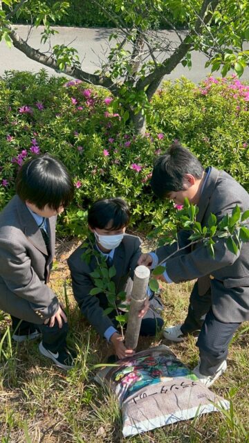 4月30日、1年生が寺本豊校長のご指導のもと、運動場横の斜面に桜の木を植樹しました。 現在、本校の春を彩る桜の木は、1期生の卒業生が植えたものです。今回新たに植えた桜の木も、数十年の時を経て、本校の春を華やかに彩ってくれることでしょう。 生徒たちとともに、その成長を見守っていきたいと思います。