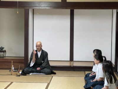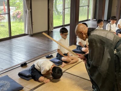 6月3日、聖宝寺の中井泰山住職をお招きし、3・4年生が座禅を体験しました。座禅指導では、座禅を組む際に「丹田」と呼ばれるお腹のあたりに力を入れることで、自然に姿勢が整うことを学びました。また、正しい姿勢を保つことで呼吸が安定し、心が落ち着くことも実感できたようです。児童たちは精神統一をしながら、真剣な表情で座禅に取り組んでいました。貴重な体験を通じて、心を調える大切さを学ぶ良い機会となりました。