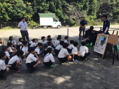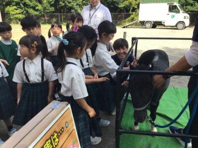 10月2日、1年生が乗馬クラブ・クレイン東海さんによる「ポニー教室」に参加しました。今年も、かわいいポニーの「やまべくん」が校庭に来てくれました。先週からこの日を楽しみにしていた子どもたちは、やまべくんの姿を見た瞬間、大興奮!笑顔いっぱいで迎えていました。教室のはじめには、馬の種類や毛色の名前などについてのお話があり、興味津々で耳を傾けていました。質問タイムでは、時間いっぱいまでたくさんの疑問に答えていただき、馬への関心がさらに深まりました。そして、子どもたちが一番楽しみにしていた「ニンジンの餌やり体験」では、ドキドキしながらも小さな手でニンジンを差し出し、やまべくんが大きなお口で美味しそうに食べる様子に、みんな嬉しそうな笑顔を見せていました。ポニーとのふれあいを通して、子どもたちは動物を大切にする気持ちや、優しさを学ぶことができました。クレイン東海さん、素晴らしい体験をありがとうございました!