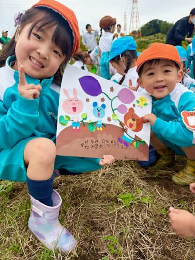 10月21日、園外保育で水の谷農園へいもほりに出かけました。子供たちは一人一人が持参したスコップを使い、自分の力で一生懸命さつまいもを掘っていました。土の奥深くにたくさんのさつまいもが実っていたため、父母の会のお母さんやお父さんにも手伝っていただきながら、収穫を進めることができました。土の中から次々とさつまいもが出てくると、子ども達は「まだある!」「また出てきた!」と大興奮。秋の実りを喜び、楽しいひとときを過ごしました。