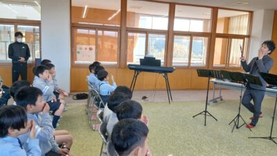 11月28日、3年生を対象にリコーダーの出前授業が行われました。今年度も講師として、中村栄宏さんをはじめ「アンサンブル・リコ・ピウ」の皆さんにお越しいただきました。授業では、リコーダーの種類を紹介していただいたり、実際に演奏を聴かせていただいたりし、子供たちは興味深そうに耳を傾けていました。知っている曲が演奏されると、体でリズムをとったり旋律を口ずさんだりと、楽しそうな様子が印象的でした。コンサートだけでなく、「きれいな音を出すために」をテーマとしたレクチャーもあり、息づかいや姿勢など基礎の基礎を学びました。ここで得た学びを、今後の音楽の授業や学習発表会での演奏にぜひ活かしてほしいと思います。