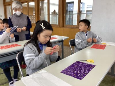 12月3日に、連鶴の出前授業がありました。「義道の連鶴を学ぶ会」から講師の方々にお越しいただき、桑名市の無形文化財である「桑名の千羽鶴」についてのお話を聞いた後、連鶴づくりに挑戦しました。連鶴は、一枚の紙から複数の鶴をつなげて折り上げる、非常に繊細な折り紙です。今回は、その中から「餌拾(えひろい)」と「花見車(はなみぐるま)」の二種類を折りました。色鮮やかな手漉きの越前和紙を使い、子供たちは集中して一生懸命に折り進め、見事に連鶴を完成させることができました。伝統的な遊びや文化に触れる貴重な時間となりました。連鶴出前授業は全2回を予定しています。次回もまた、新しい連鶴に挑戦できるのが楽しみですね。