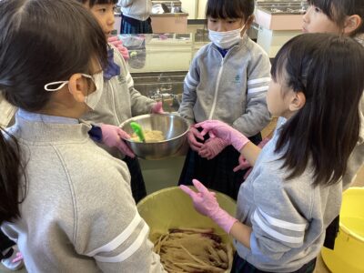 12月12日、3年生の児童が育てた日野菜を使い、漬け込み作業を行いました。作業では、まずきれいに洗った日野菜を漬物樽に入れ、その上にあら塩と米ぬかを混ぜたものを丁寧に振りかけます。この工程を何度も繰り返し、最後に重石をのせて漬け込み作業が完了しました。作業を終えた子供たちからは、「早く食べてみたい!」「美味しく漬かりますように!」と、出来上がりを心待ちにする声がたくさん聞こえました。自分たちで育て、漬け込んだ伝統の味がどのように仕上がるのか、完成が楽しみですね。