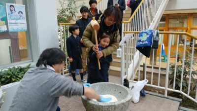 12月20日、親子ふれあい教室「餅つき大会」を開催しました。当日はあいにくの空模様となりましたが、雨を吹き飛ばすような元気な声が学校中に響き渡りました。天候を考慮し、急きょ室内での実施へと変更し、安全に配慮しながら行いました。餅つきは玄関前のスペースで行われました。一生懸命に杵(きね)を振るう子供たちの姿はとても力強く、周囲からは温かい拍手と「よいしょー!」という威勢の良い掛け声が上がっていました。味付けは、定番の「さとう醤油」「きなこ」「あんこ」「大根おろし」の4種類に加え、今年度は新たに「なもち」が登場。バラエティ豊かな5つの味に、子供たちも「次はどれにしようかな」と目を輝かせていました。自分たちでついた“つきたて”のお餅は格別で、会場は笑顔と「おいしい!」という声であふれていました。今回の開催にあたり、ご協力いただきました保護者の会役員の皆さまに心より感謝申し上げます。