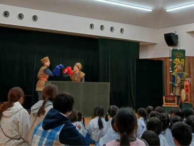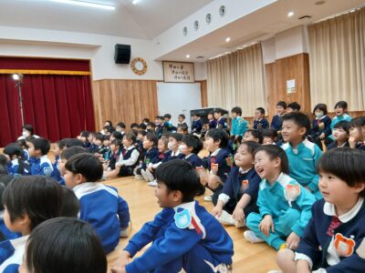 2月10日、人形劇団さんさんの皆さんによる人形劇をホールで鑑賞しました。ざるやクリップ、お玉、座布団など、身近な家庭用品を使って作られた亀やうさぎが登場すると、子ども達は驚いた表情を見せていました。昔話『おむすびころりん』の上演では、おじいさんのおむすびが穴に転がり落ち、ネズミたちの愉快な歌が聞こえてくると、子ども達は思わず口ずさんだり、物語の世界に入り込んだりしながら楽しんでいました。会場には笑い声と笑顔があふれ、心温まるひとときとなりました。