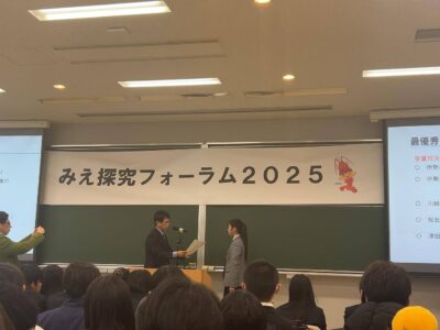 本校生徒が参加した「みえ探究フォーラム」において、口頭発表部門40組、ポスター発表部門36組の中から、それぞれ最優秀賞に選出されました。口頭発表部門では、本校の生徒が自身の研究成果をわかりやすくまとめ、高い評価を受けました。また、ポスター発表部門では、理数探究部の生徒たちが共同で取り組んだ研究が最優秀賞に選ばれました。生徒たちは、自らの興味・関心にもとづいてテーマを設定し、文献調査、実験、アンケートなど多様な方法を用いて探究を深めてきました。当日の発表では、研究の背景や目的、検証の過程、得られた考察を的確に整理し、聴衆に伝わる表現力を発揮しました。今回の受賞は、生徒一人一人の主体的な学びと日頃の探究活動が高く評価された結果です。今後も本校では、生徒が自らの問いを追究し続ける探究活動を推進してまいります。