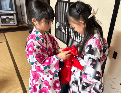和服や浴衣の着方、所作、動きの美しさについて学びます。また伝統的な日本舞踊を体験します。その立ち居振る舞いから日本のたたずまい、礼節、謙譲の美徳、感謝を感じとることにつながります。日本の伝統文化を守ることの意義について知る機会にもなっています。
