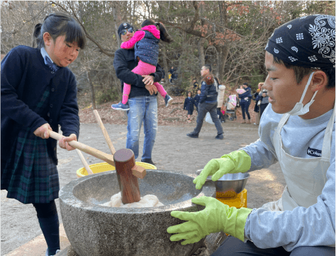 毎年正月前後には、日本の代表的な伝統行事の餅つき大会を行います。つきたてのお餅を味わう喜びはもちろんのこと、もち米がお餅になる過程を楽しく体験でき、お米を主食とする日本人と食との関わりについて学ぶよい機会ともなってい