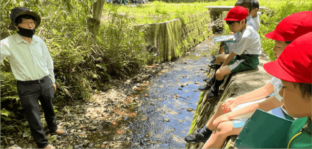 2年生は学校前を流れる嘉例川の上流で発生するホタルを観察する「ホタルの学校」。