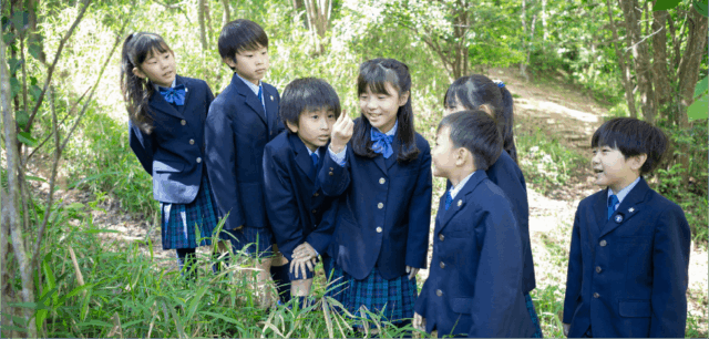 秋には栗やどんぐりの実がたわわに実り、木々は見事な紅葉色に染まります。また、敷地内にはビオトープも整備されており、水辺の生き物が豊かな生態系を作り出しています。それらの樹林や水辺をテーマにした学習を通して、自然環境を大切にする意義についても学んでいます。本校の恵まれた自然環境に包まれて過ごす学校生活は、五感を刺激し、おおらかな心と豊かな感性を育みます。