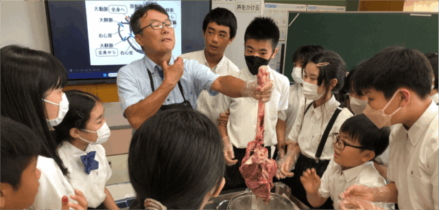 本校では豚の心臓の実物を使った解剖実習を行っています。豚の心臓は人間のものとよく似ているため、解剖学習に適しています。教科書には心臓がイラストで紹介されていますが、実物はまったく異なります。4つの部屋、弁、血管などがその感触と併せてまさに手に取るように理解できます。最初は戸惑いを見せる子供もいますが、やがて慣れてきて見たり触れたりすることができるようになります。本物で学んだ体験は子供の心に深く刻まれます。
