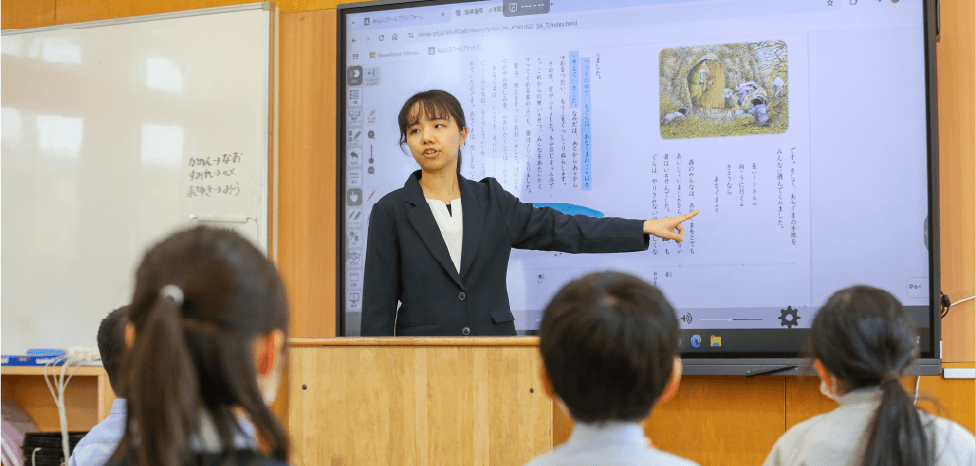 本校では教育ICTの充実を図るため、全ての教室で電子黒板を活用した授業を行っています。電子黒板は、デジタル教科書の活用に加え、画像、音声、動画、インターネットなどを利用したインタラクティブな授業を展開することが容易となります。視覚や聴覚に訴えかけることで児童の集中力がより高まり、学習意欲や興味を引き出すとともに知的好奇心を刺激します。電子黒板を利用した授業はとても分かりやすくて楽しいと児童にも好評です。そして、それらの教材や資料は本校のカリキュラムに沿って独自に作成することができ、授業をより計画的に進めることができます。板書の時間も短時間で済むため、その時間をより深い内容の説明や応用問題に充てることもできます。また、授業内容はデータとして保存できるので、前回までの内容を瞬時に電子黒板上に再現できるため、容易に復習ができる上、授業の連続性を保つことができます。