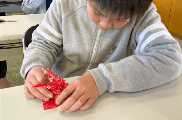 桑名の伝統文化である「連鶴」について学び、1枚の和紙から2羽、3羽とつながった鶴を折りました。
