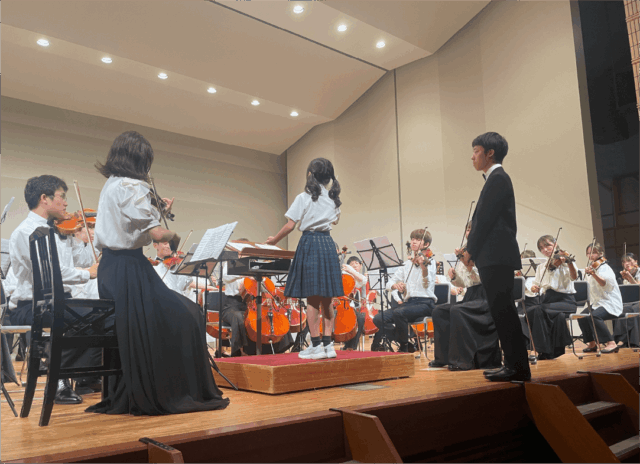 名古屋大学管弦楽団によるオーケストラの演奏を鑑賞しました。35名もの奏者による演奏は音色の美しさはもちろんのこと、迫力も満点でした。クラシックの楽曲演奏に加え、楽器紹介や児童代表による指揮者体験、5年生との合奏もあり、とてもバラエティに富んだプログラムでした。