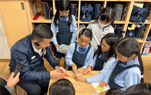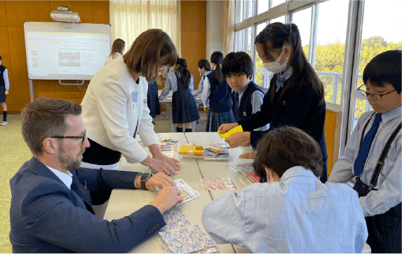 本校には年間を通じて、世界各国から多くの方が視察に訪れます。児童は学校で習った英語を駆使しながらコミュニケーションをとり、恒常的に国際交流を行っています。多彩な国々から訪れるため異文化理解にもつながっています。非英語圏のゲストとも英語でコミュニケーションを取る体験ができることで、まさにグローバル・マインドを育成できる機会となっています。