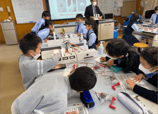 太陽光発電などの自然エネルギーの活用について、発電の比較実験などを行い理解を深めました。また、手回し発電機を使って白熱灯と蛍光灯、