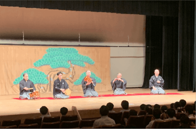 笛、小鼓、大鼓、太鼓の4種類を使用した能楽 囃子の演奏を聴き、能のかけ声なども教えてもらいました。