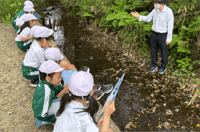 大学の先生を講師にお招きし、2年生で行われる「ホタルの学校」の前に実地観察をしました。