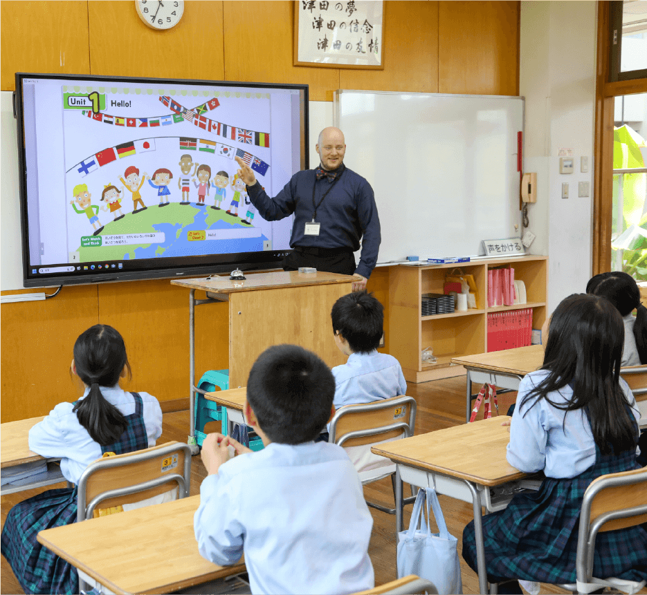 1年生から週2時間、英語の授業を実施しています。オリジナルのカリキュラムによって、英語の4技能( 読む、書く、聞く、話す)を総合的に伸ばし、グローバルに活躍できる人材の基礎を育みます。授業はネイティブ教師が担当するため“生きた”英語が学べ、授業以外でもネイティブの教師とコミュニケーションを取ることができます。休み時間に会話を楽しんだり、英語を教えてもらったりすることのできる環境です。