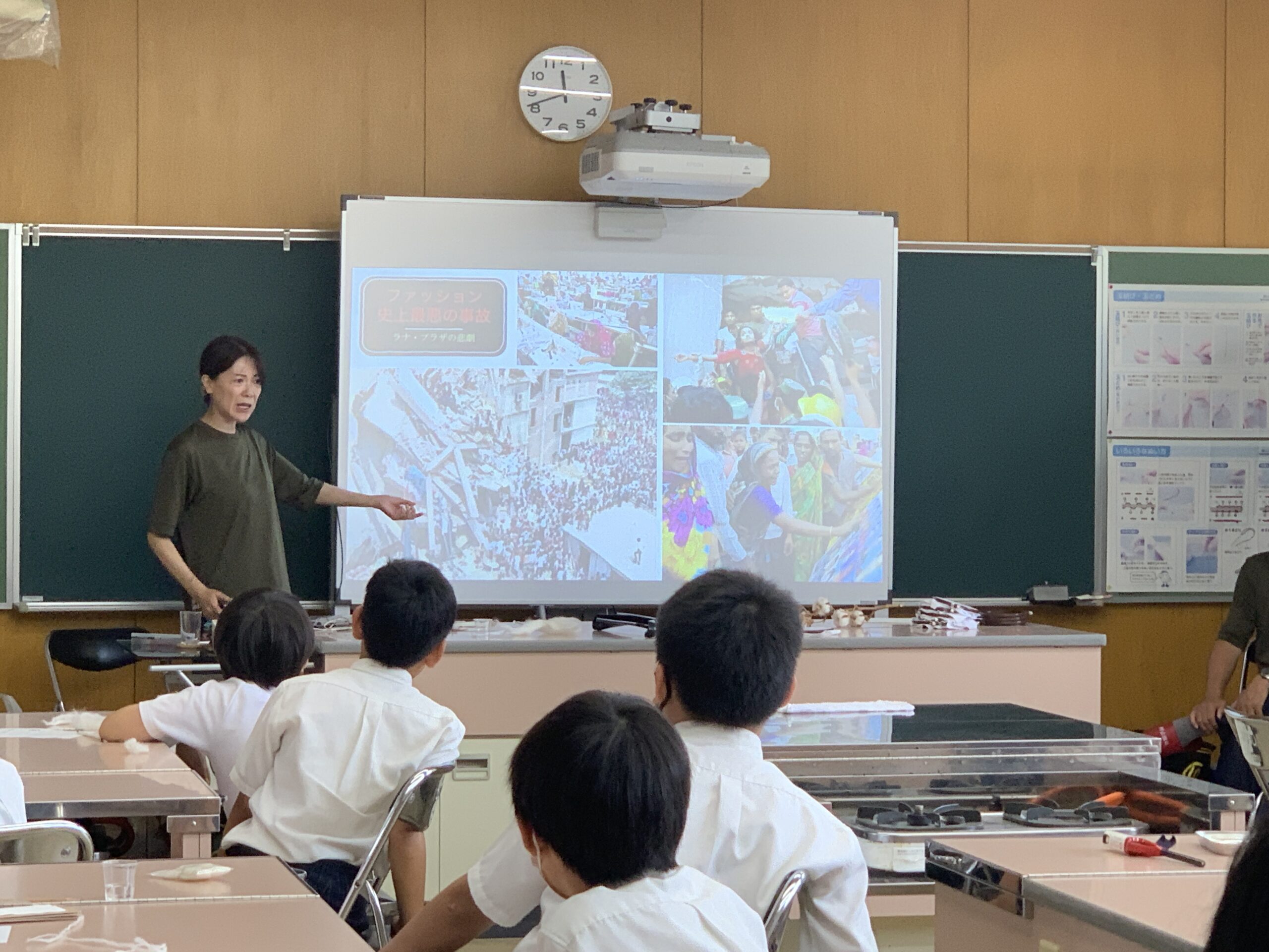7 月11日(木)、6年生の家庭科で出前授業を実施しました。今回は、ニッケグループ日本毛織株式会社の方を講師にお招きし、「衣・食・住」の「衣」について学習しました。授業では、繊維や布の種類、ウールの構造、羊毛から糸をよること、布の撥水性、燃焼性についてクイズや実験を交えながら楽しく教えていただきました。授業の後半には、SDGsの取り組みとして、日本で1年間に廃棄される服の量から環境への影響を考えました。そして服を通して地球の環境のために自分たちができることを学びました。今日学んだことを服を買うときに思い出したり、今後の生活に取り入れたりしてほしいと思います。