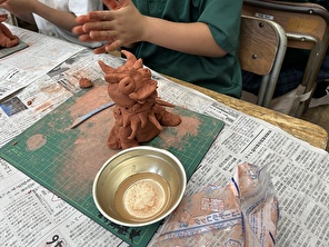 7月19日(金)にシーサー作りの出前授業をしました。長船(おさふね)侍夢(じむ)先生を講師に招き、シーサーの作り方について教えていただきました。空き瓶の周りに専用の粘土を巻いて胴体にし、手足や顔などのパーツを作って組み合わせていきます。大事なことは「笑いながら楽しく作る」と先生は仰っていました。特に顔を作る際にはお手本通りにはせず、自分の思うイメージに合わせており、犬や猫のような動物顔にしたり、ネックレスを付けたり、羽を付けてまるで飛び立つかのような格好にしたりと子供たちの個性が存分に出ていたことと思います。世界に一つしかないシーサーを作ることができ、子供たちはとても満足そうでした。またいろいろな文化に触れられると良いですね。