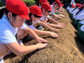 2年生が大根の種まきをしました。種まきから収穫まで、今年度も柳川農園さんにお世話になります。大根の種を初めて見たという児童もいて、興味津々で種を眺めていました。種をまいた後、大きく育つようにお祈りしながら土を被せました。大根がどれくらい大きくなるか楽しそうに予想する様子が見られました。