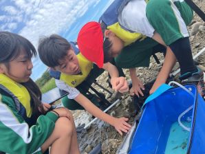 10月22日(火)に5年生が水辺の環境調査をしました。水辺の環境調査は、学校の前を流れる嘉例川の水質や水温を調べ、水辺に住む生き物を採集して、それらを通じて環境について学ぶ行事です。5年生を3つのグループに分け、それぞれ上流・中流・下流などを調査しました。水温やまわりの様子などを調べた後は、楽しみにしていた生き物の採集です。サワガニ・ヨシノボリ・ヌマエビ・タイコウチ・カワニナなど、多くの種類の生き物を見つけました。
