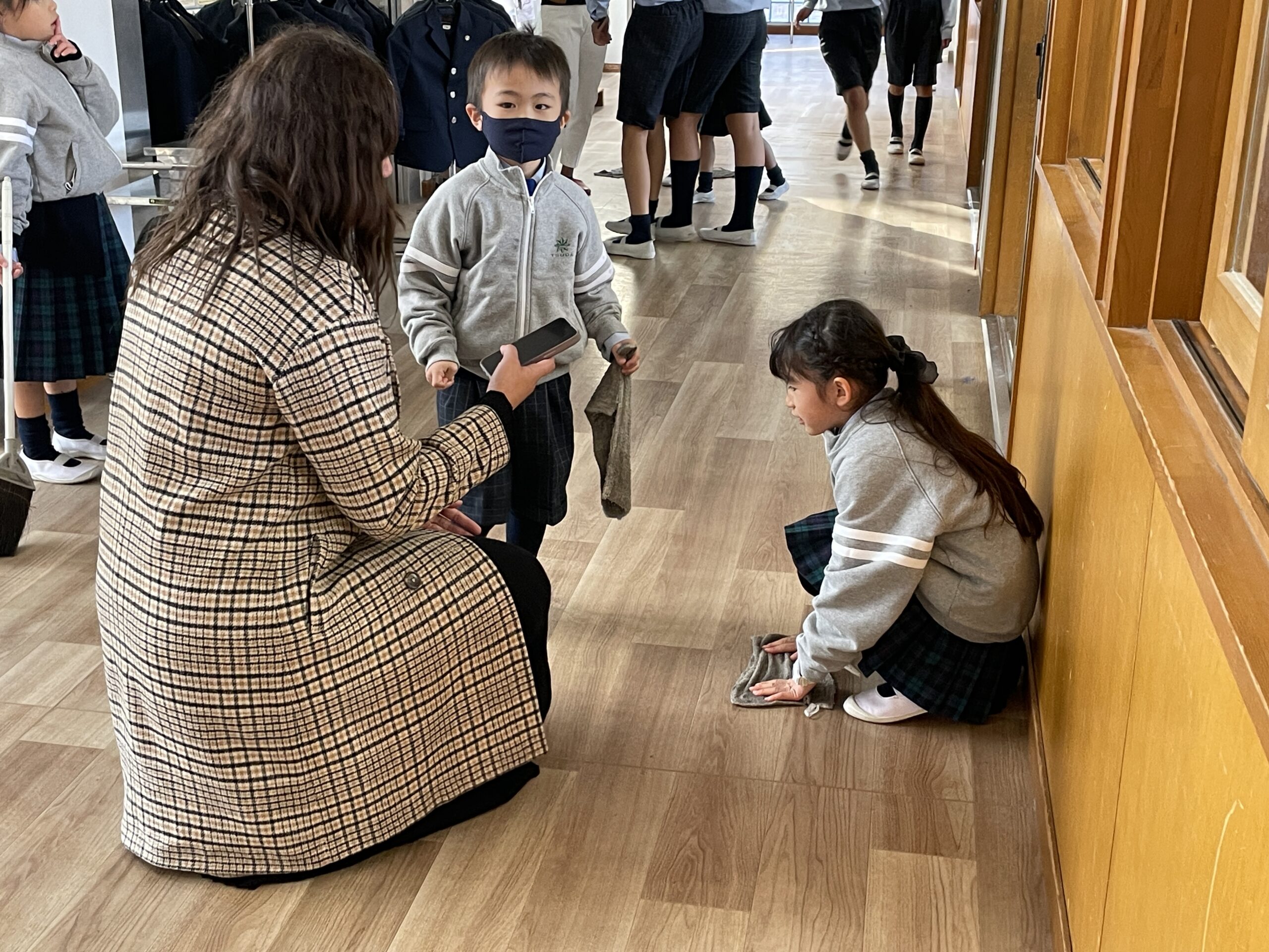 昨日のオランダに引き続き本日(11月27日)はオーストラリアから海外視察団が来校されました。児童は視察団の方々と共に給食を食べ、一緒に掃除を行いました。子供たちは英語や身振り手振りをしながらコミュニケーションをとり、楽しい時間を過ごしました。また、カザフスタンの小学校とオンラインでつなぎ、小学校の清掃活動の様子を見ていただきました。最後に、視察団の方からお土産をいただきました。お土産は児童の会の役員の人たちが代表として受け取りました。