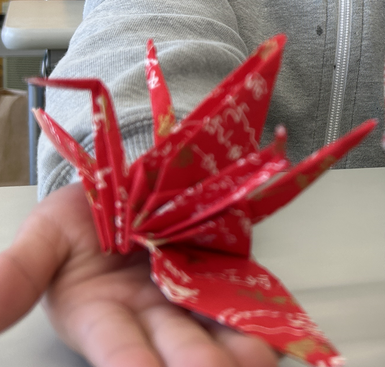 12月10日(火)に3年生で連鶴出前授業がありました。先週に引き続き「義道の連鶴を学ぶ会」から講師の方々にお越しいただき、名市無形文化財である「桑名の千羽鶴」や折り紙、折り鶴の歴史についてお話を聞いた後、連鶴作りに挑戦しました。1枚の紙から2羽~最高97羽の鶴をつなげて折り上げる連鶴。今回挑戦したのは大きな鶴の”しっぽ”に、2羽の小さな鶴が繋がりあう「昔男(むかしおとこ)」と2羽の鶴が”つばさ”同士で繋がる「妹背山(いもせやま)」の2種類です。前回に比べてレベルアップしており、小さい鶴を空中で折る作業に苦戦していましたが、前回より早く仕上げる児童がほとんどでした。来週で最終回となり、さらにレベルが上がるとのことで、仕上げるのに困難が予想されますが心を込めてていねいに折ってほしいと思います。とても愉しみですね。