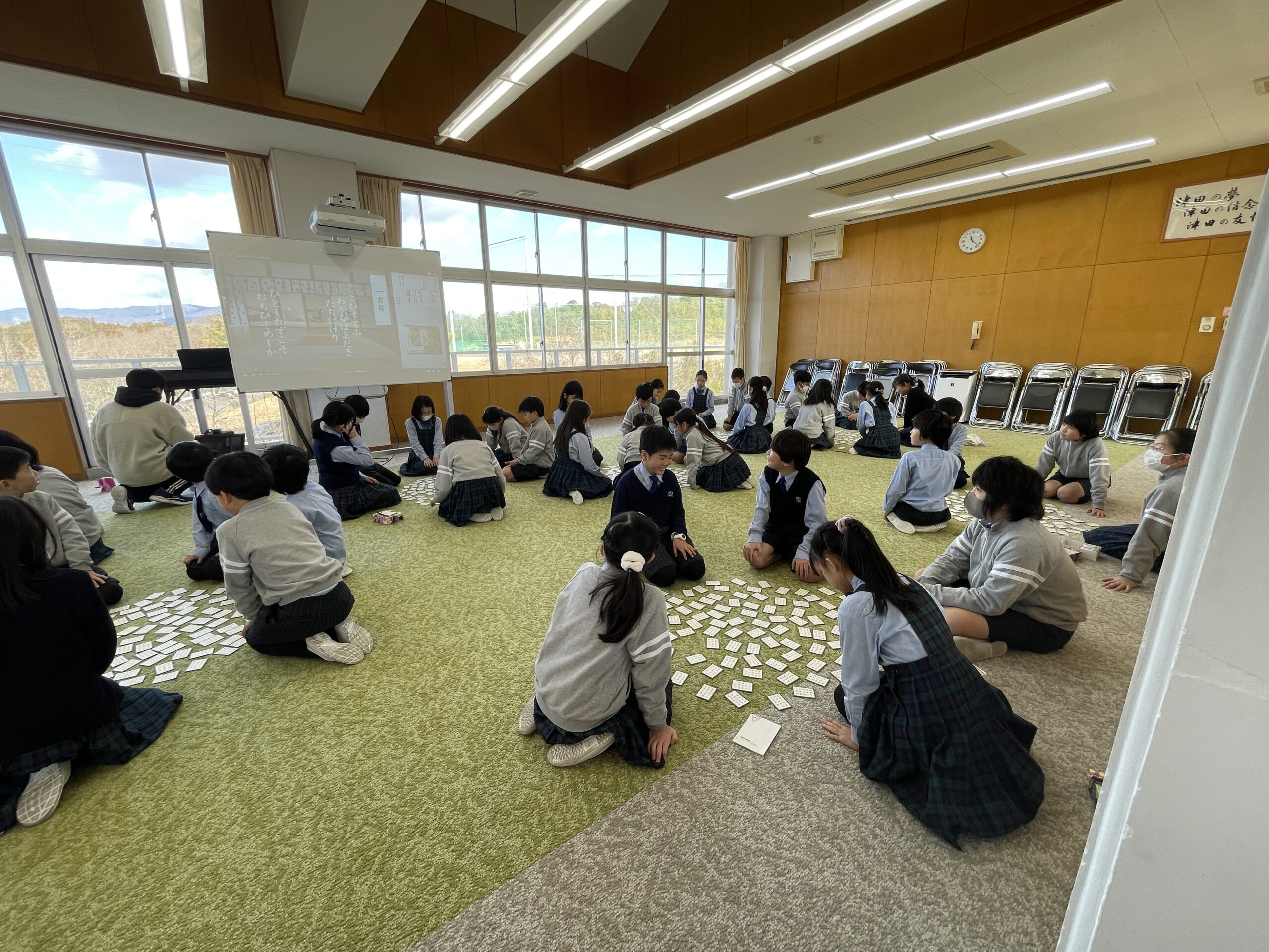 1月17日(金)、百人一首大会を行いました。読み上げられる歌を聞こうと静寂に身を置いた瞬間、「パンッ!」という音が会場のあちこちで響きました。その音に一喜一憂して大会は盛り上がりました。自分のお気に入りの札が読まれた時には、「自分のものだ!」と言わんばかりに生き生きと札に飛びついていました。また、来年も一首でも多く自分で取れるように頑張りたいですね。