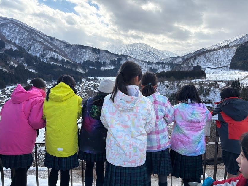4年生の「雪の学校」が始まりました。舞台となる白川郷周辺は2mを超える積雪で一面の銀世界です。この豪雪地帯で雪まみれの2泊3日を過ごします。まずは荻町の合掌集落に到着し、合掌造りの「基太の庄」さんで郷土料理であるの朴葉味噌の定食をいただきました。朴葉味噌は子供たちにもたいへん好評でした。続いて合掌集落を散策しました。さすがは世界遺産の観光地、海外からの観光客でごった返しています。迷惑にならないよう、できるだけすいているルートで見学し、事前に学習した合掌造りのことなどを目の当たりにしながら確認しました。また展望台からのすばらしい景色を見て、荘川にかかる吊り橋も渡り、合掌集落を堪能しました。