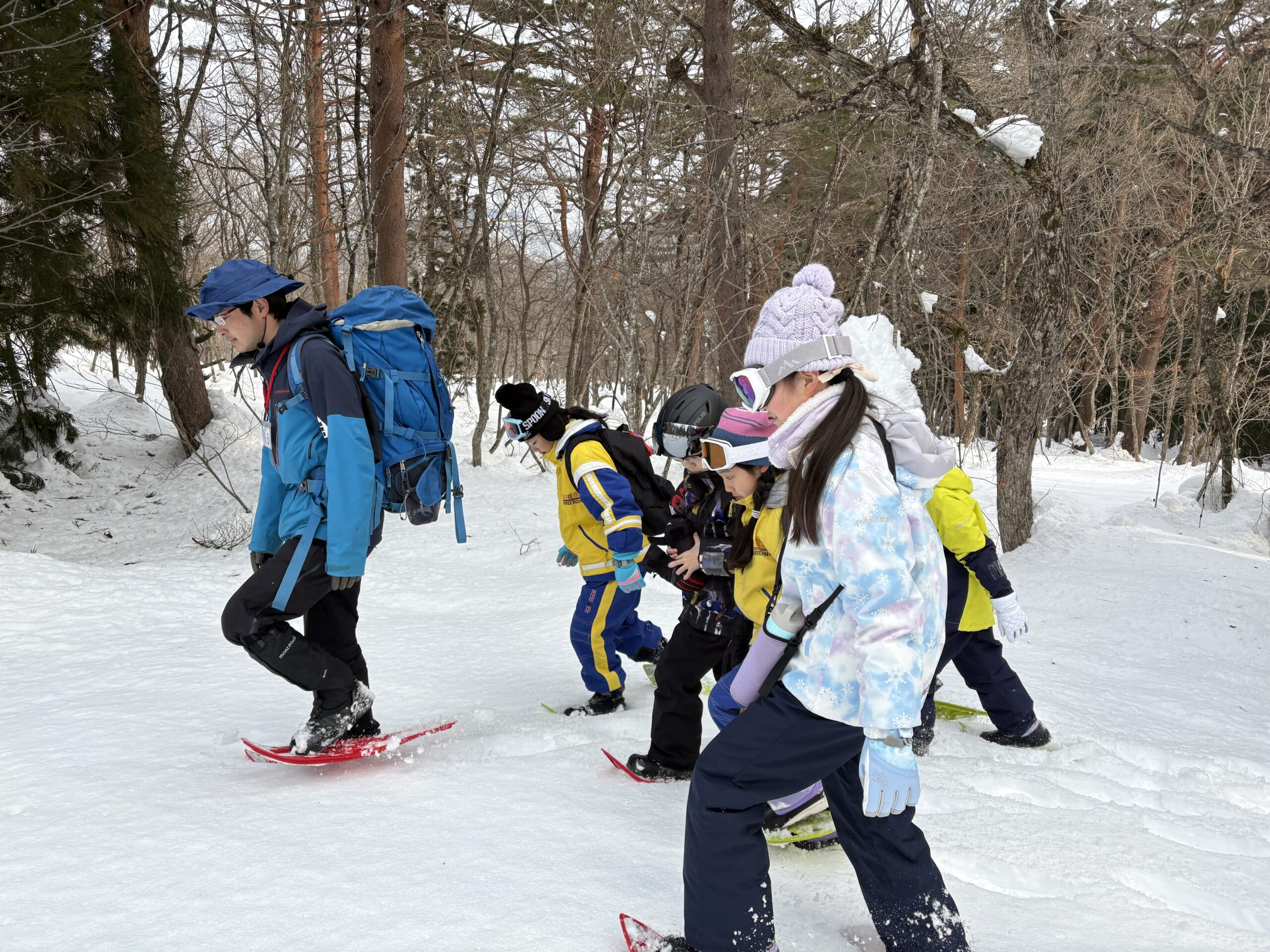 4年生の雪の学校の2日目です。朝の集いを行い、体操と持久走で身体を目覚めさせてから、美味しい朝食をいただきました。午前のプログラムはスノースライダーと雪の森のガイドウォークでした。2m以上も積もっている雪の上をスノーシューで歩くガイドウォークは新鮮な体験です。森の中で動物の足跡や木の幹に残る熊の爪あとを見つけたり、走って逃げるリスを発見したりできました。スノースライダーは丘の斜面をソリで滑り降りるとても楽しい体験です。この日はかなりスピードの出る雪質で、そのスピードとスリルを存分に味わいました。